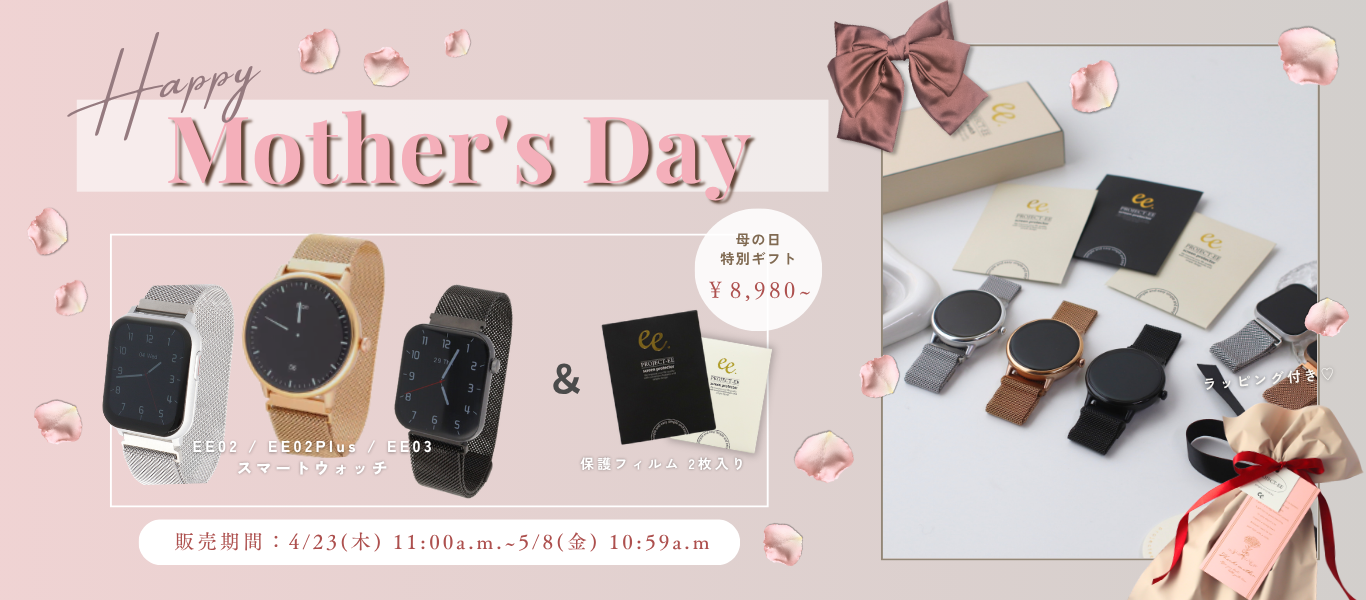 いつもPROJECT-EEをご愛顧いただき、誠にありがとうございます✨ もうすぐやってくる「母の日」。 日頃の感謝を込めて、お母さんの毎日をさらに輝かせる特別なギフトセットを特別な価格でご用意いたしました🎁💖 💖母の日限定【スペシャルギフトセット】💖 4/23(木)11:00~5/8(金)10:59までの期間限定! 「いつまでも元気で、おしゃれを楽しんでほしい」という想いを形にする、豪華セットが登場します✨ 今回のセットは、お母さんの好みに合わせて選べる9つのスタイルをご用意! すべてに「ラッピング袋&梱包ボックス」が付いてくるので、届いてすぐにプレゼントいただけます。 【選べる3つのラインナップ】 王道の人気NO.1!EE02セット✨ 可愛くもオシャレにもコーディネートできるEE02と、画面を守る保護フィルムの安心セット。 セット内容: 本体、保護フィルム2枚、ラッピング 洗練された大人の丸型!EE02 Plusセット💎 気品あふれる3カラー!1.43インチのAMOLEDディスプレイで文字もくっきり見やすい。 セット内容: 本体、保護フィルム2枚、ラッピング 驚きの軽さと薄さ!EE03セット⌚ 超極薄7mm&約16gの軽量設計。手元をたくさん動かすお母さんにも優しい着け心地。 セット内容: 本体、保護フィルム2枚、ラッピング 🔋お母さんの健康と毎日をしっかりサポート🔋 PROJECT-EEのスマートウォッチは、機能性もバツグン! 健康管理: 歩数計、心拍数モニター、睡眠モニターで元気な毎日を💪 日常の便利: LINEや着信の通知を手元でお知らせ。スマホをバッグに入れたままでも安心です。 おしゃれ: アクセサリー感覚で身につけられるスタイリッシュなデザイン。⚠️ご注意: 各モデルとも数量限定となります!完売次第終了となりますので、お早めにお買い求めくださいませ🏃♀️💨...