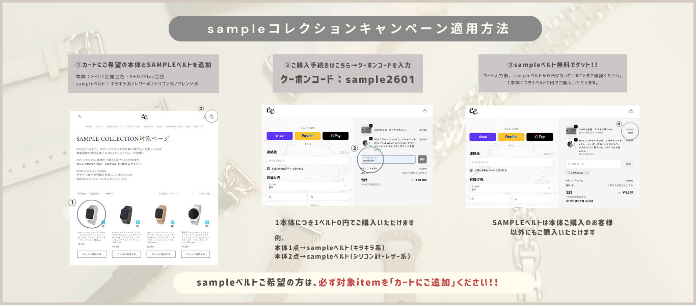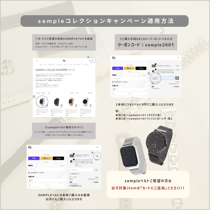 PROJECT-EE SAMPLE COLLECTION ✨ 日頃よりPROJECT-EEをご愛顧いただき、誠にありがとうございます。 PROJECT-EEより、スマートウォッチのお買い物がもっと楽しくなる数量限定の特別企画「SAMPLE COLLECTION」が登場しました🪄✨ 22mmベルトの中から、デザイン性や世界観を大切にして制作された特別なSAMPLEベルトをご用意しています。 今回は、SAMPLEベルト単体でもご購入可能&EE02 / EE02 Plus 本体をご購入の方は0円でゲットできる特別なキャンペーンとなっています🥳🤍 SAMPLE COLLECTION とは? SAMPLE COLLECTIONは、デザイン性や世界観を大切にして制作された22mmベルトの特別コレクションです✨ ・一般販売では手に入らない・数量限定での特別配布・コレクション性の高いデザイン アパレルのサンプルコレクションのように、“今だけ・ここだけ”の特別感を楽しめる企画となっています🪄 SAMPLE COLLECTION ラインナップ&価格 SAMPLE COLLECTIONでは、お好みの雰囲気に合わせて4つの系統からお選びいただけます✨ 💎 キラキラ系 アクセサリー感覚で楽しめる、華やかなデザイン✨手元を一気に主役にしてくれる存在感が魅力。 🤍 レザー系...
