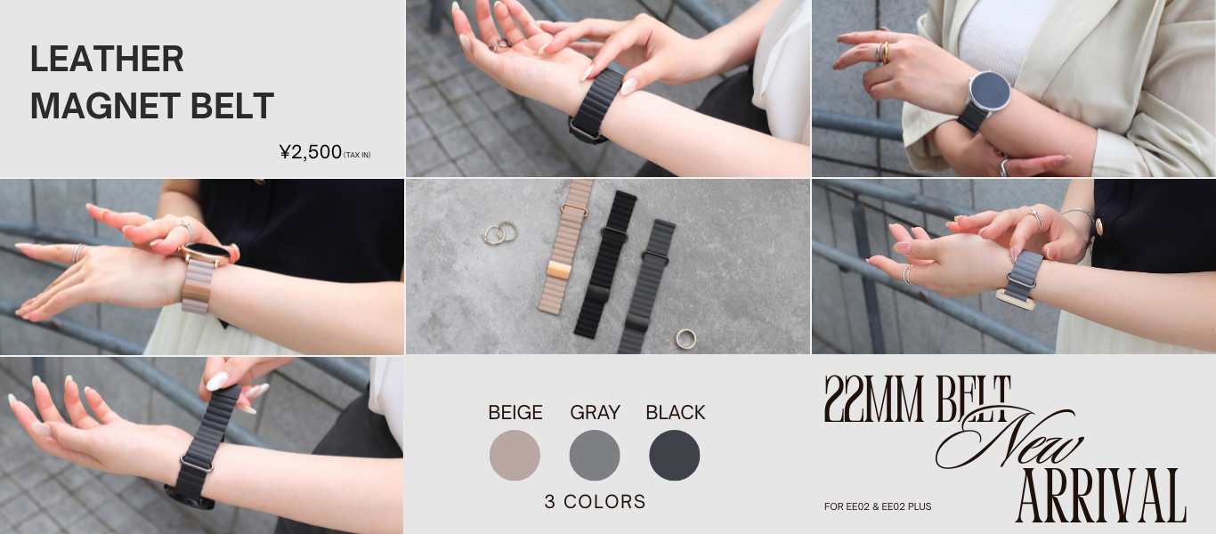 【新作ベルト】ピタッと、瞬間着脱。スタイルと機能性を両立した「レザーマグネットベルト」登場。デザイン、機能性、着け心地。そのすべてを妥協しない「レザーマグネットベルト」が、毎日のスマートウォッチライフを劇的に変えてくれます。 商品名: レザーマグネットベルト (EE02 / EE02 Plus対応) 価格: 2,500円(税込) カラー: BEIGE / GRAY / BLACK 【新作ベルト】ピタッと、瞬間着脱。スタイルと機能性を両立した「レザーマグネットベルト」登場。デザイン、機能性、着け心地。そのすべてを妥協しない「レザーマグネットベルト」が、毎日のスマートウォッチライフを劇的に変えてくれます。 商品名: レザーマグネットベルト (EE02 / EE02 Plus対応) 価格: 2,500円(税込) カラー: BEIGE / GRAY / BLACK
